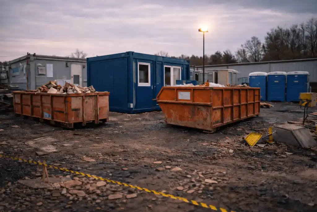 Über die Entsorgung hinaus übernehmen wir die vollständige Baustellenlogistik. Von Containern und temporären Einrichtungen bis zu Schwarz-/Weiß-Bereichen und gesicherten Arbeitszonen sorgen wir für reibungslose, regelkonforme Abläufe ab dem ersten Tag.